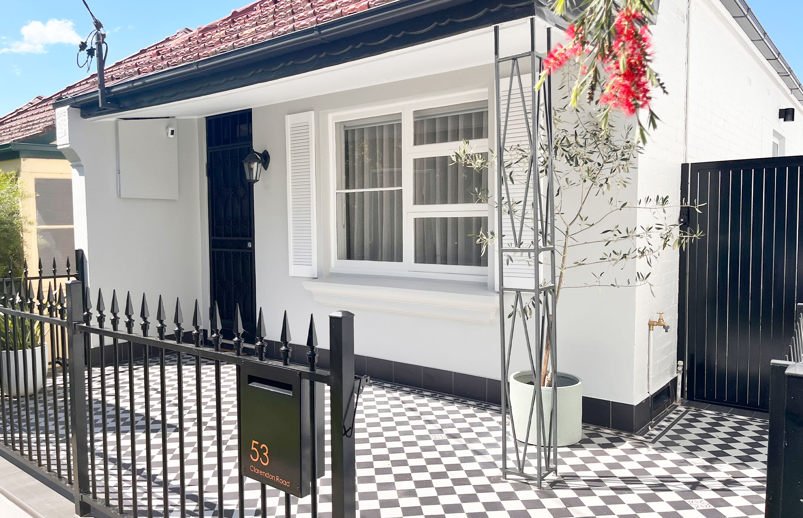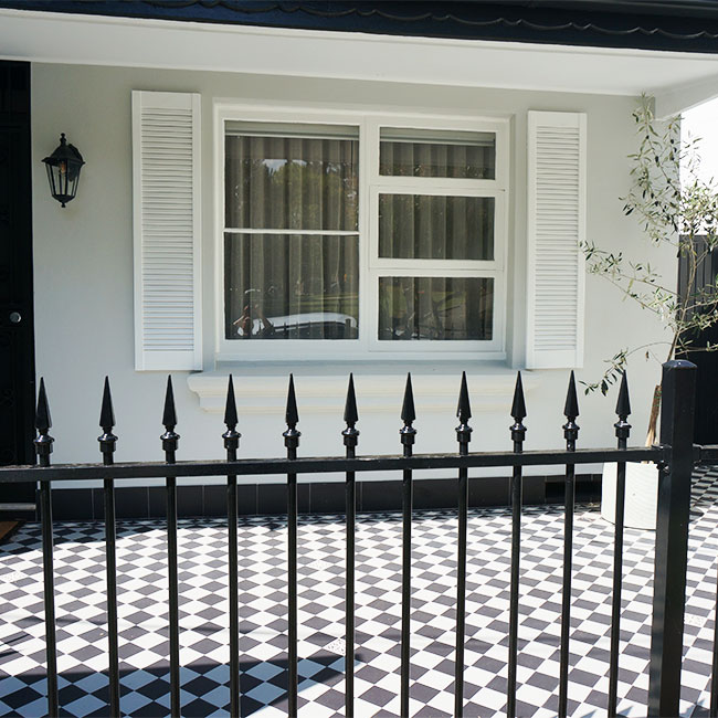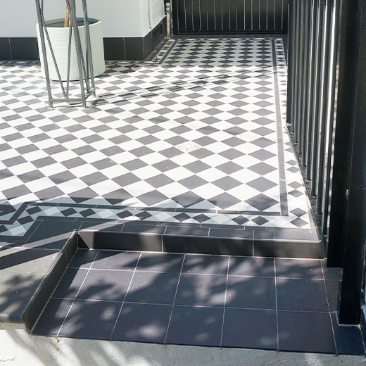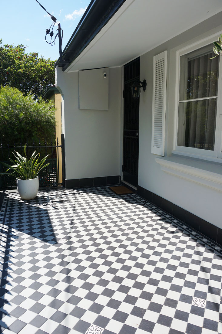 Located in Stanmore, this residential project beautifully showcases the charismatic Checkerboard Tessellation in a classic light grey and black colourway. The timeless pattern enhances the home’s architectural elegance, perfectly complementing the dwelling’s exterior aesthetic. Framed by a Norwood border, the intricate detailing of white, black, and light grey tones adds visual depth and cohesion, elevating the overall design with refined sophistication. Scattered throughout the pattern are decorative encaustic ‘Metz’ tiles, introducing subtle character and a touch of heritage charm. This combination of pattern, border, and colour brings a perfect balance of tradition and modernity — a versatile design choice that continues to captivate. The Checkerboard Tessellation not only defines the veranda with elegance but also reflects enduring style and craftsmanship that stands the test of time.