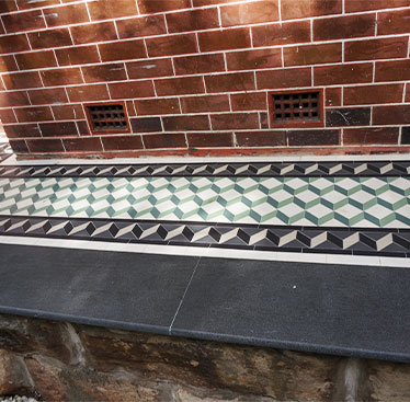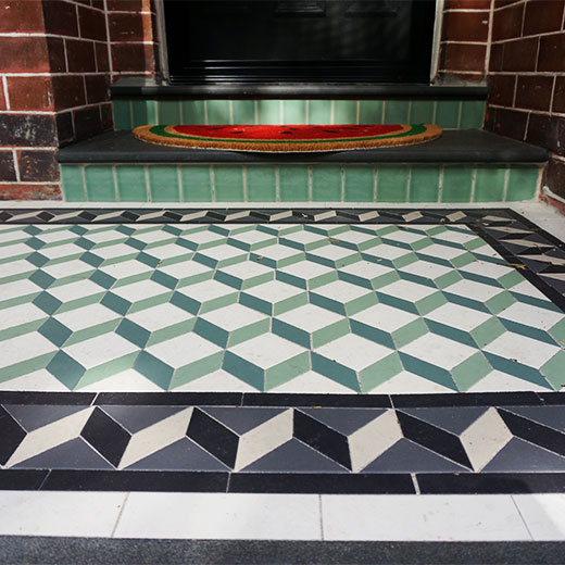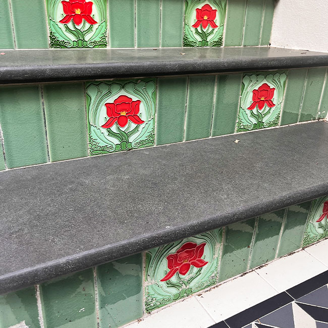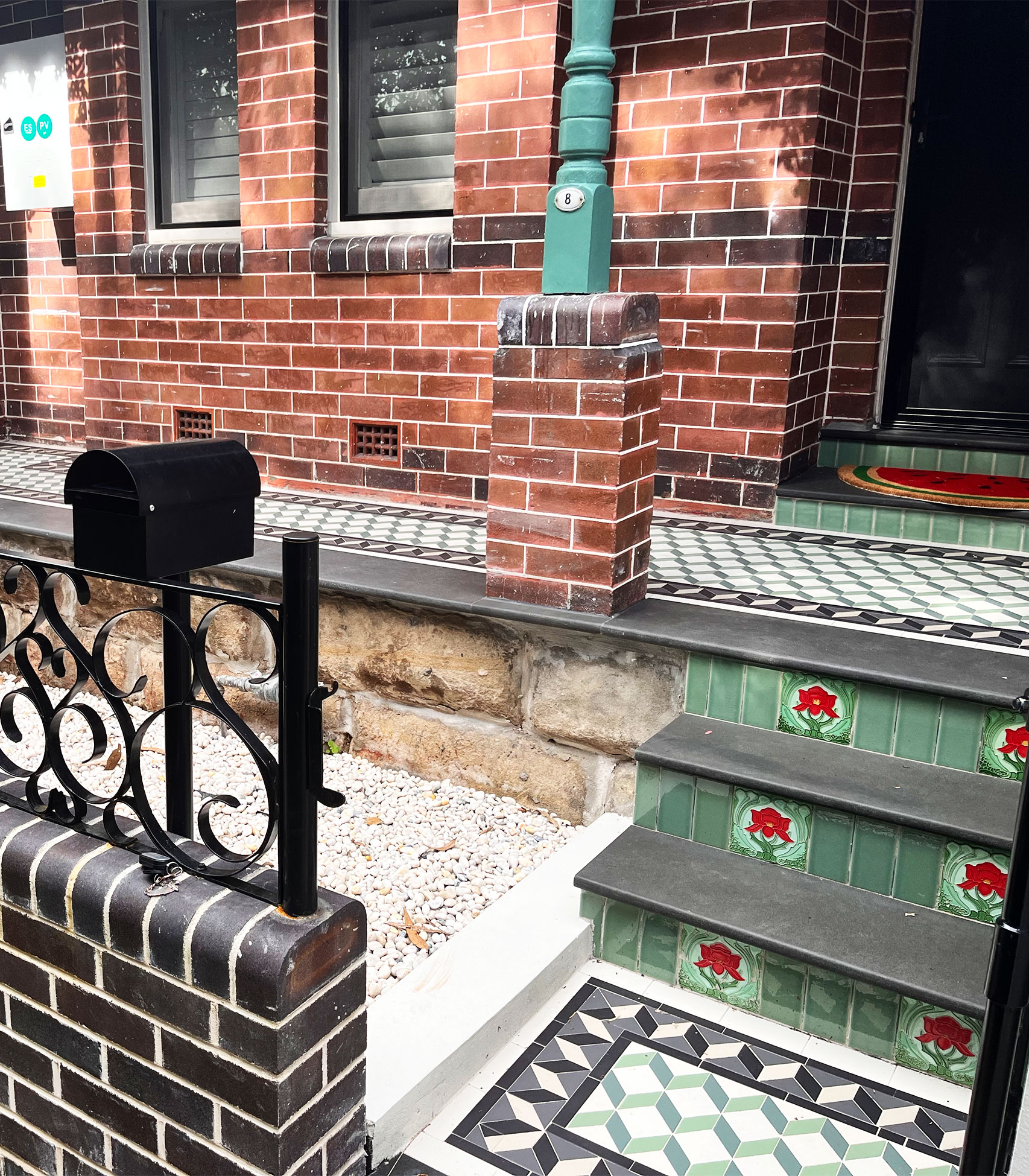 Adding architectural depth, a bluestone step tread was used across the veranda and stairs, providing both strength and structure to theĀ  design. The stair risers are elevated with decorative detail through embossed ‘Love Flower Green’ tiles, paired with light green craquelle Victorian subways. This thoughtful combination highlights heritage artistry while perfectly complementing the Killara tessellated pattern, delivering a refined, welcoming entrance.