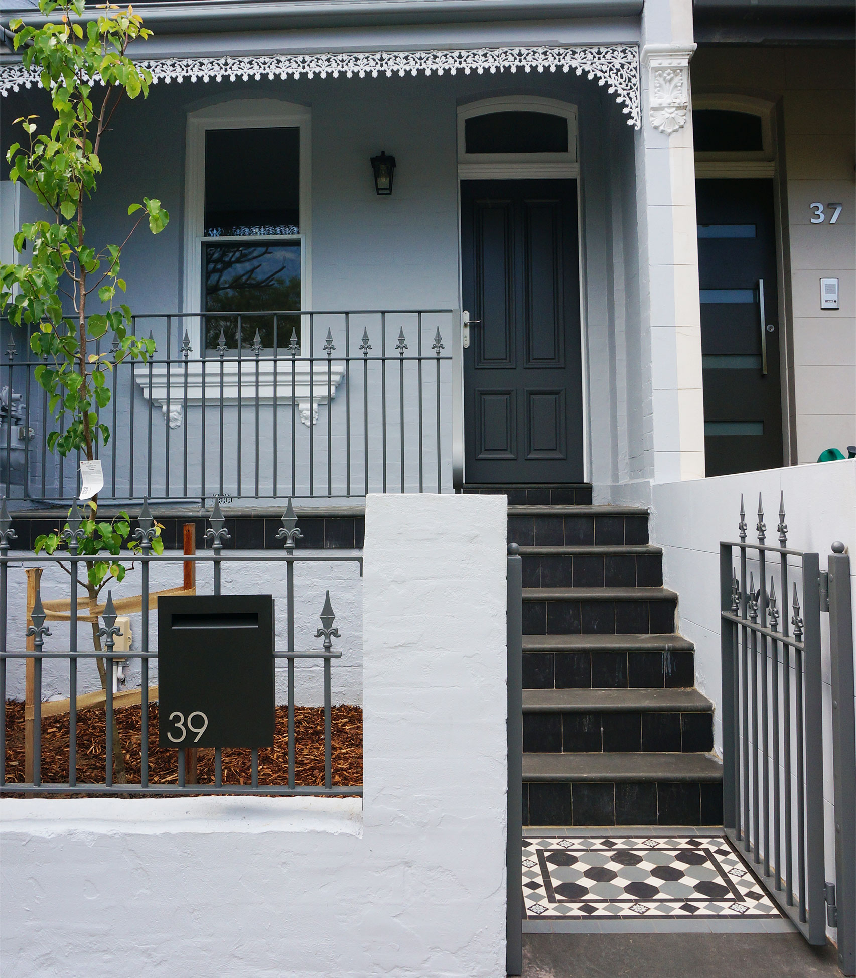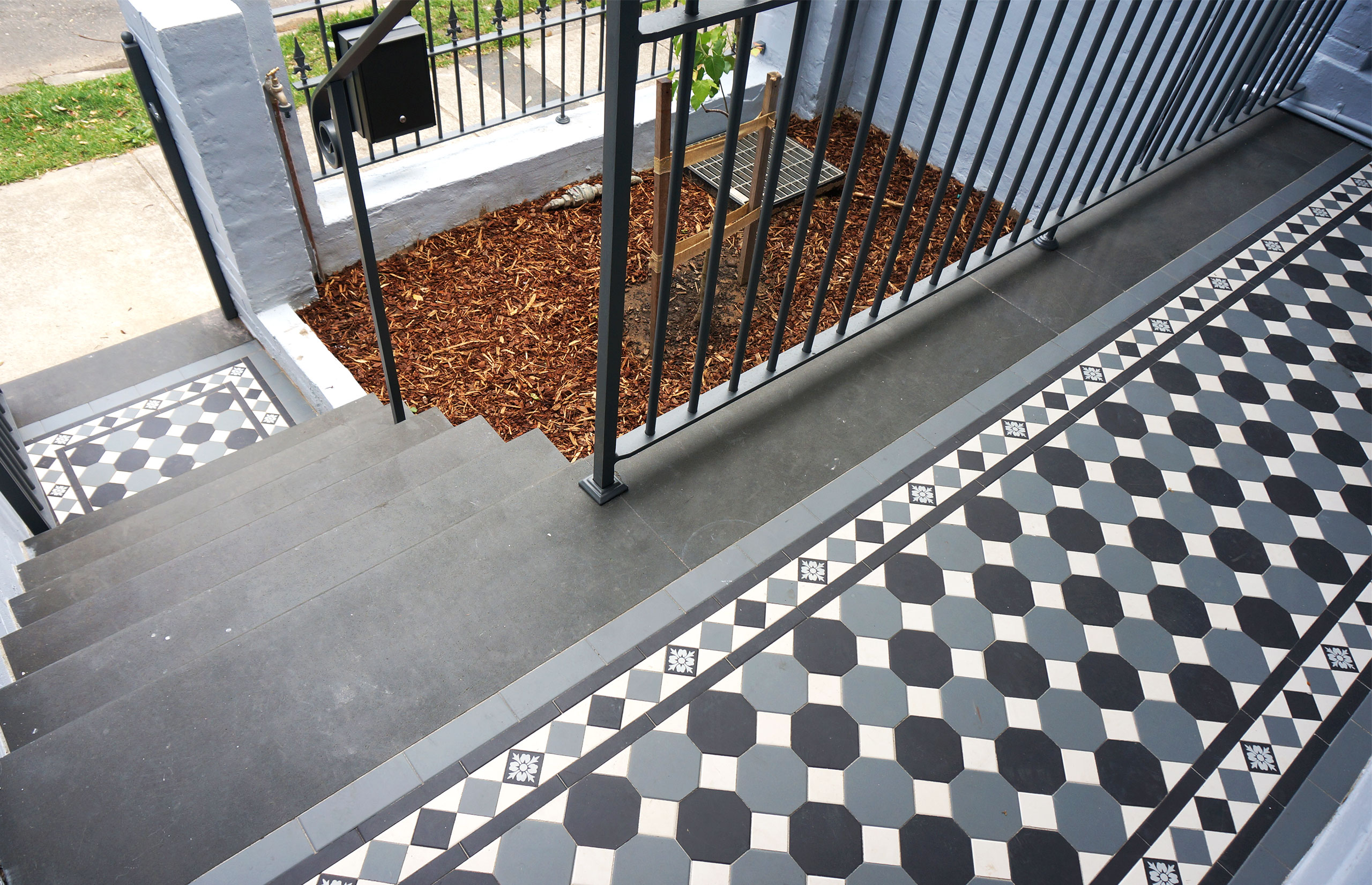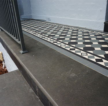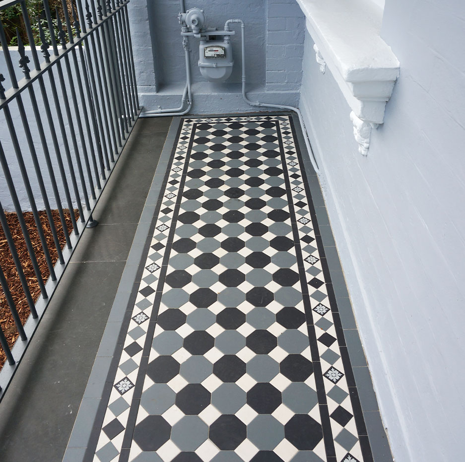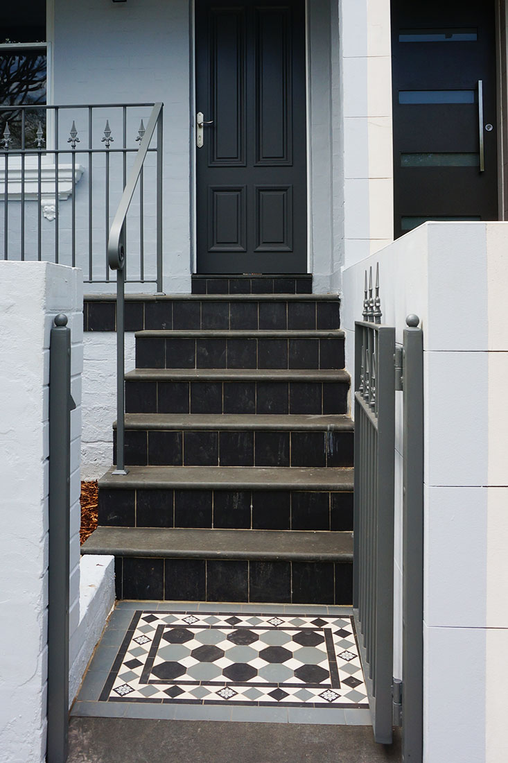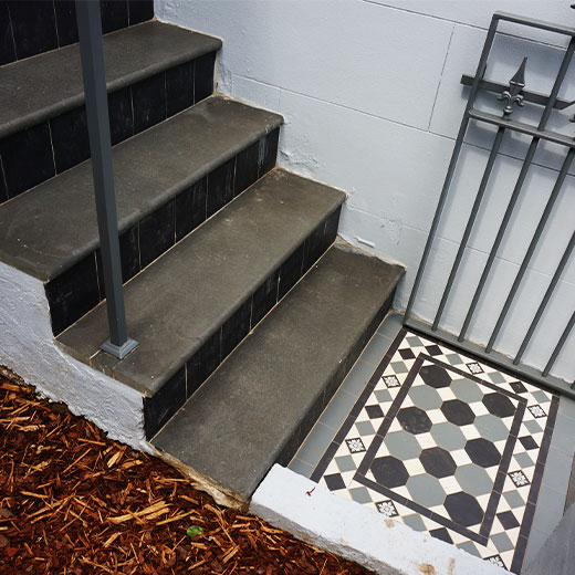 Located in the heart of Annandale, this residential project beautifully showcases an Octagon & Dot tessellation applied to the veranda and front landing path. The elegant black, white, and blue-grey colour palette brings depth and sophistication, adding timeless charm to the home’s exterior. The tessellated pattern is framed by a Norwood border, harmoniously tying in the same tones while introducing an additional decorative feature- the encaustic tile ‘Bordeaux Neative”, enhancing the overall visual appeal. Completing the design, bluestone step treads frame the veranda edge, providing structure and balance. The bluestone continues through the stair threshold, creating a seamless flow, while tessellated black 100×100 tiles are applied to the risers, adding refined contrast and completing this elegant, cohesive outdoor design.