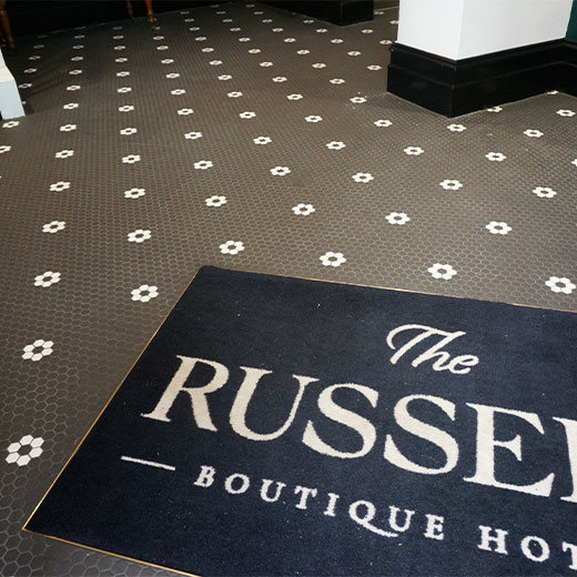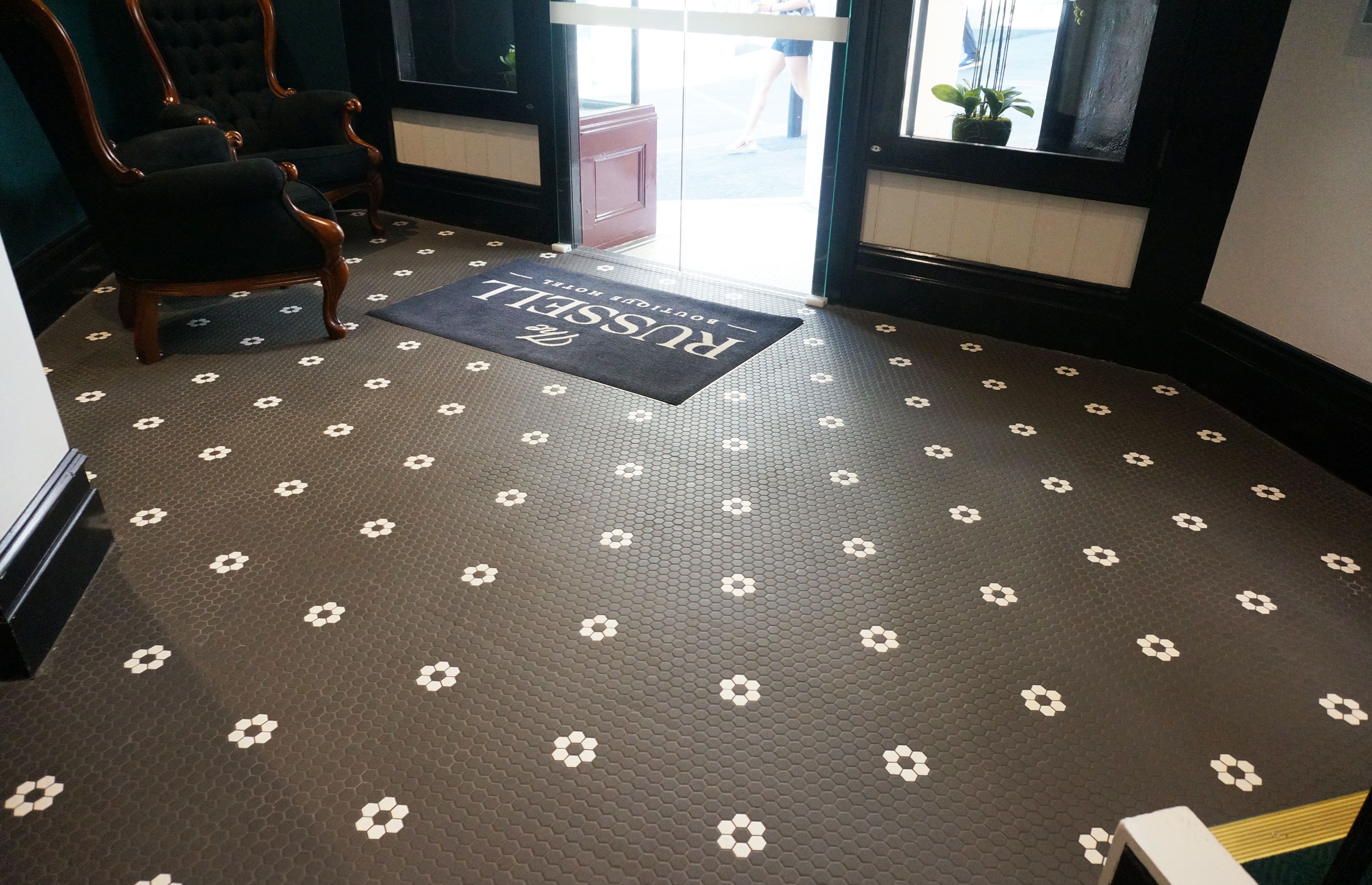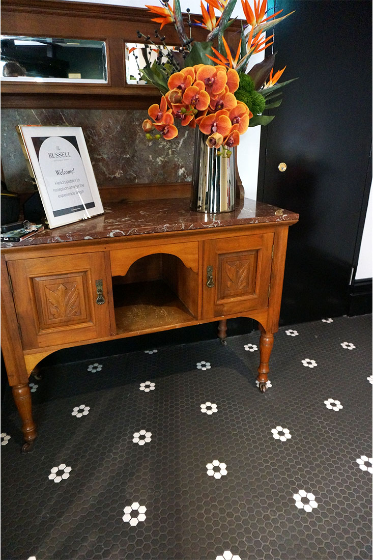 The Russell Boutique Hotel features M02 black and white porcelain mosaics throughout its front lobby entrance, creating a striking blend of heritage charm and modern durability — a perfect reflection of timeless design in a commercial setting.