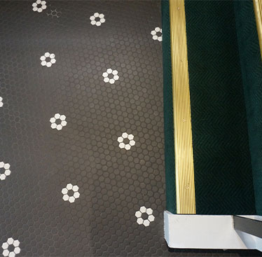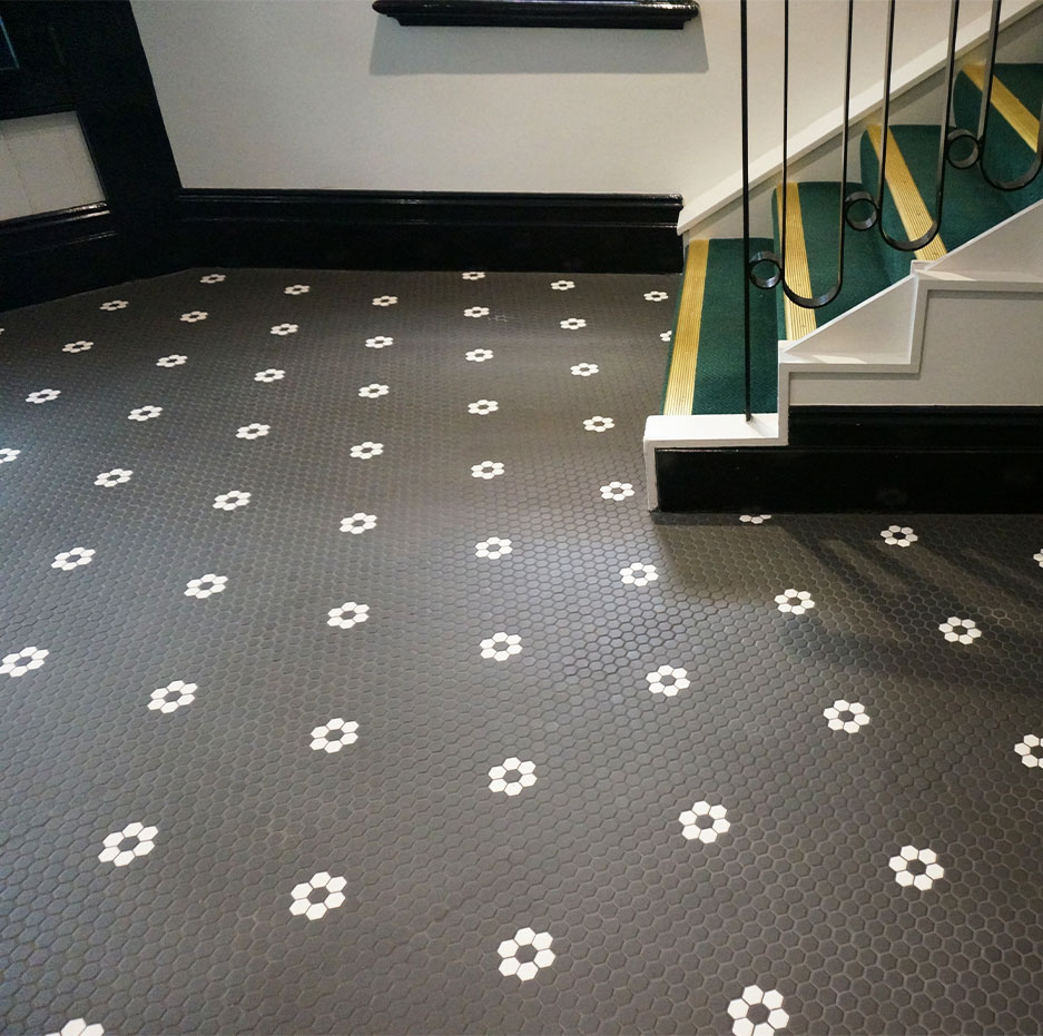 “The Russell Boutique Hotel beautifully showcases our M02 black and white porcelain mosaics in its front lobby entrance. The design delivers timeless charm and durability, perfectly complementing the hotel’s boutique aesthetic and creating an inviting first impression.”