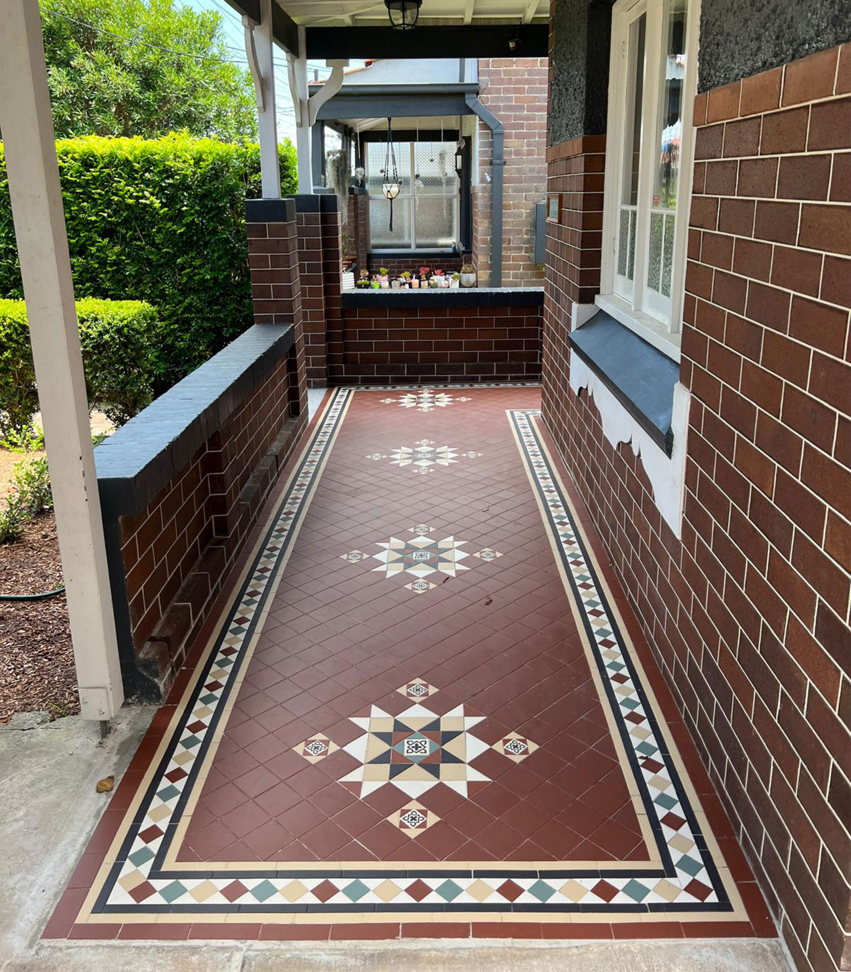 Located in Haberfield, this stunning Toorak Panel tessellation transforms the wraparound veranda at the front entrance into a captivating heritage feature. The colour palette embraces classic tones of red, vanilla, white, black, and green, creating a timeless aesthetic that complements the home’s architectural character. The design is beautifully framed by a Norwood border, incorporating green, red, and vanilla to seamlessly unify the layout. The Toorak panels are placed in thoughtful intervals to suit the space, with the star-panel colours echoed in the border for a cohesive flow. Decorative Lyon encaustic tiles enrich each panel, setting the tone for this striking installation. Completing the design, a grey terrazzo step tread with white flecks adds refinement to this exceptional residential project.